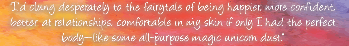 I was beginning to see how I’d used my body as a scapegoat, blaming it for everything that was wrong with my life. I’d clung desperately to the fairytale of being happier, more confident, better at relationships, comfortable in my skin if only I had the perfect body—like some all-purpose magic unicorn dust. But when I got completely honest with myself, I realized I’d been no happier at my ideal weight than I’d been 60 pounds above it. If this was all about the numbers, then something sure as hell didn’t add up. The voice of my ED said it was because I still needed to be thinner. Now that I’d begun recovery, I knew where that path would take me. I had recovering anorexic friends who served as further proof that thin ≠ happy.